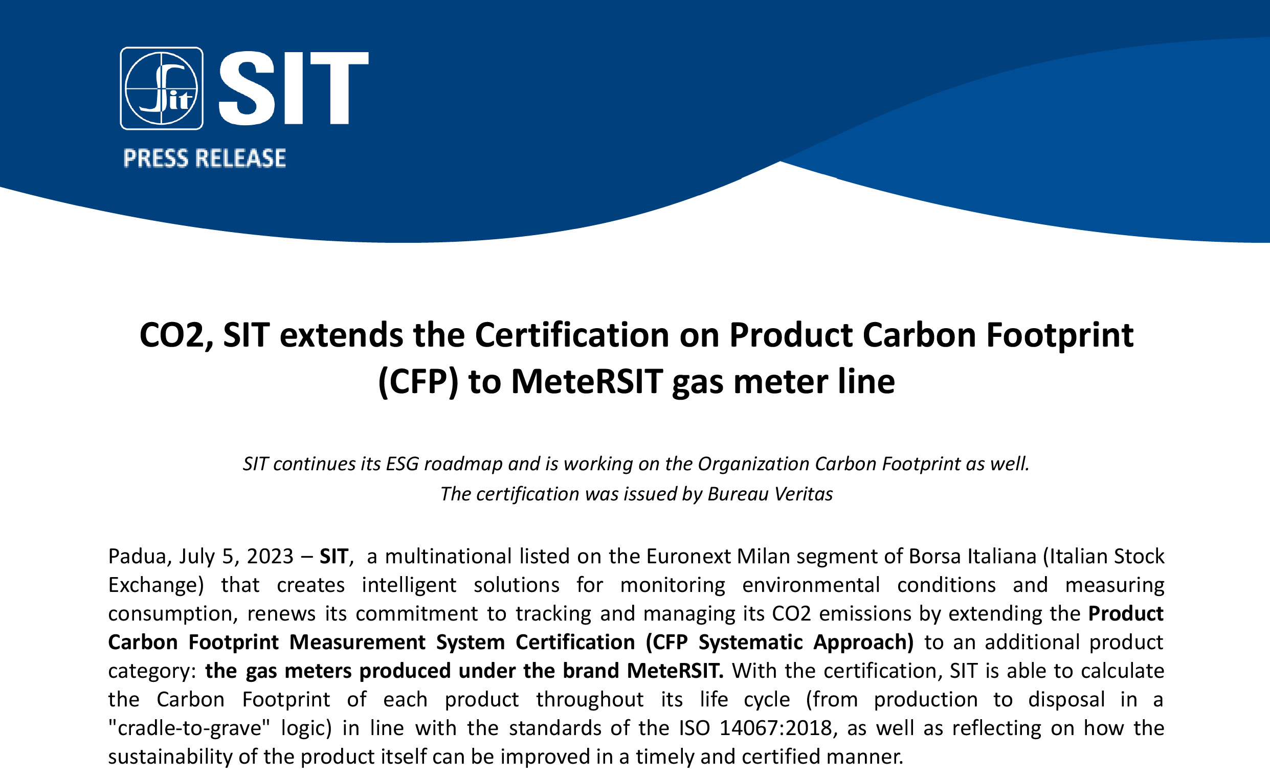 category: the gas meters produced under the brand MeteRSIT. With the certification, SIT is able to calculate