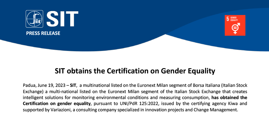 Padua, June 19, 2023 – SIT, a multinational listed on the Euronext Milan segment of Borsa Italiana (Italian Stock Exchange) a multi-national listed on the Euronext Milan segment of the Italian Stock Exchange that creates intelligent solutions for monitoring environmental conditions and measuring consumption, has obtained the Certification on gender equality, pursuant to UNI/PdR 125:2022, issued by the certifying agency Kiwa and supported by Variazioni, a consulting company specialized in innovation projects and Change Management.
