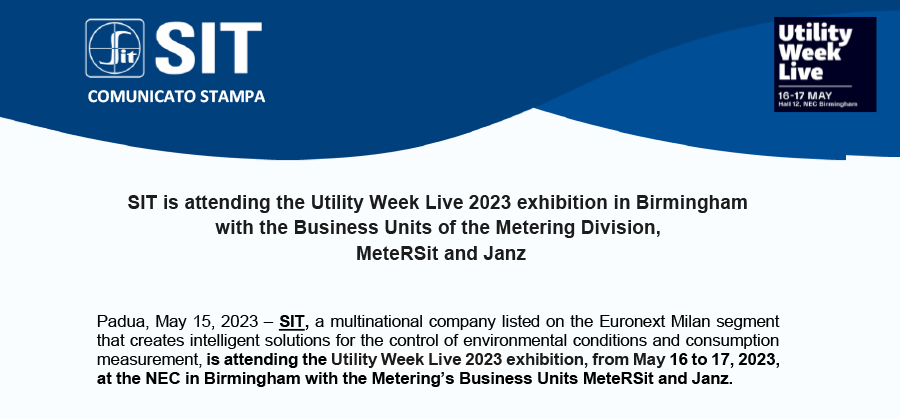 Padua, May 15, 2023 – SIT, a multinational company listed on the Euronext Milan segment that creates intelligent solutions for the control of environmental conditions and consumption measurement, is attending the Utility Week Live 2023 exhibition, from May 16 to 17, 2023, at the NEC in Birmingham with the Metering’s Business Units MeteRSit and Janz.