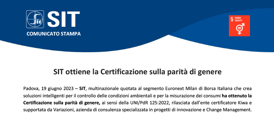 Padova, 19 giugno 2023 – SIT, multinazionale quotata al segmento Euronext Milan di Borsa Italiana che crea soluzioni intelligenti per il controllo delle condizioni ambientali e per la misurazione dei consumi ha ottenuto la Certificazione sulla parità di genere, ai sensi della UNI/PdR 125:2022, rilasciata dall’ente certificatore Kiwa e supportata da Variazioni, azienda di consulenza specializzata in progetti di innovazione e Change Management.