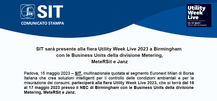 Padova, 15 maggio 2023 – SIT, multinazionale quotata al segmento Euronext Milan di Borsa Italiana che crea soluzioni intelligenti per il controllo delle condizioni ambientali e per la misurazione dei consumi, parteciperà alla fiera Utility Week Live 2023, che si terrà dal 16 al 17 maggio 2023 presso il NEC di Birmingham con le Business Units della divisione Metering, MeteRSit e Janz.