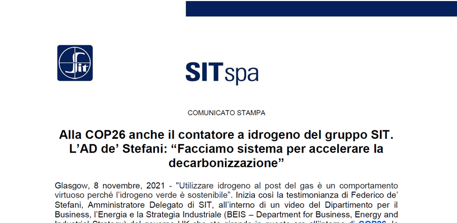 Alla COP26 anche il contatore a idrogeno del gruppo SIT. L’AD de’ Stefani: “Facciamo sistema per accelerare la decarbonizzazione”