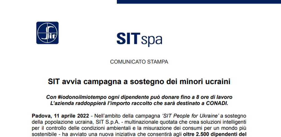 Con #iodonoilmiotempo ogni dipendente può donare fino a 8 ore di lavoro L’azienda raddoppierà l’importo raccolto che sarà destinato a CONADI. Padova, 11 aprile 2022 - Nell’ambito della campagna ‘SIT People for Ukraine’ a sostegno della popolazione ucraina, SIT S.p.A. - multinazionale quotata che crea soluzioni intelligenti per il controllo delle condizioni ambientali e la misurazione dei consumi per un mondo più sostenibile
